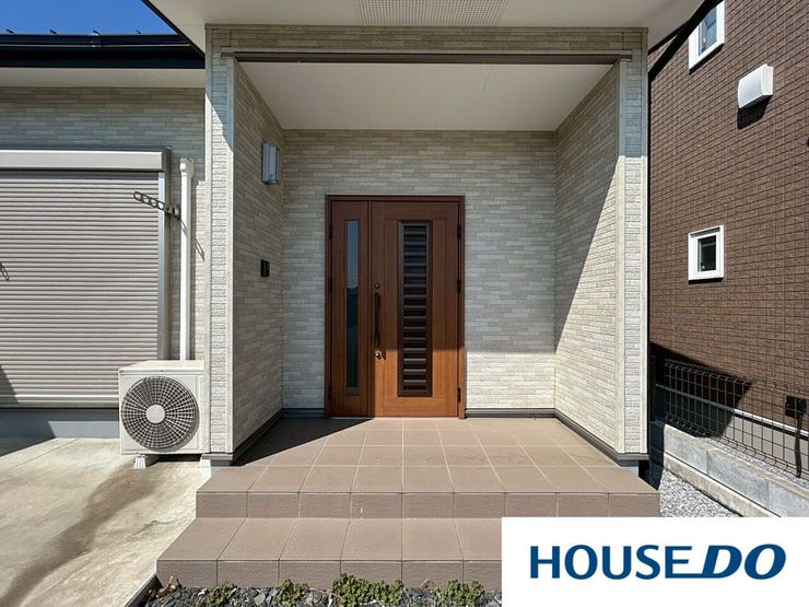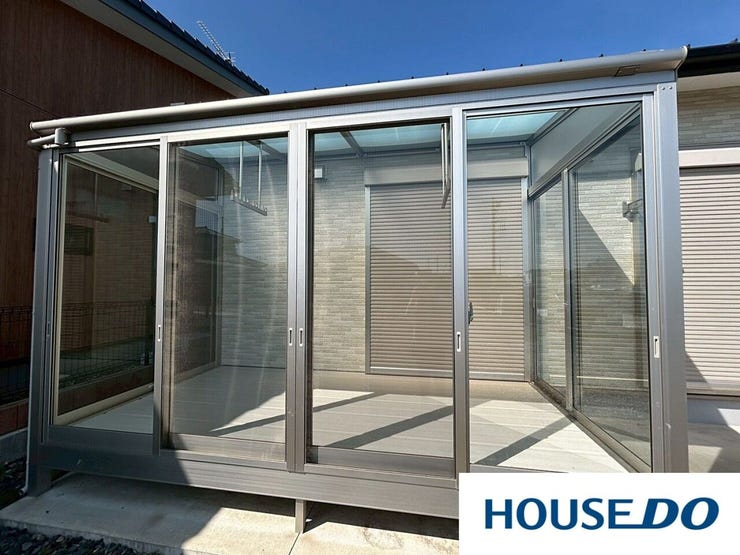 日当たり良好な南庭には、雨の日も安心なサンルームを完備!洗濯物干しや趣味の空間として重宝します。落ち着いた色合いの外壁に重厚感のある玄関ドアが映える、平屋スタイルの開放感あふれる住まいです♪